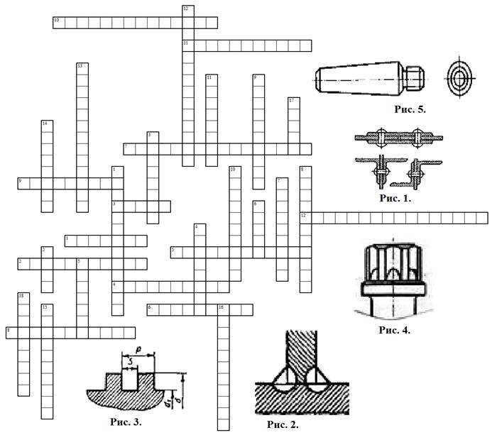 По горизонтали: 1. Это созданные человеком материальные средства, используемые им для расширения его функциональных возможностей в различных областях деятельности с целью удовлетворения материальных и духовных потребностей? 2. Какой шов образуют заклепки и склепываемые детали? 3. Как называется устройство для соединения концов валов или для соединения валов с установленными на них деталями? 4. Какие подшипники - это опоры вращающихся деталей, работающие в условиях относительного скольжения поверхности цапфы по поверхности подшипника, разделенных слоем смазки? 5. Достоинство зубчатой передачи? 6. Вид передачи зацеплением? 7. Вид ремня в ременной передаче? 8. Как называется передача, имеющая зубчатые или фрикционные колеса с перемещающимися осями? 9. Какие зубчатые колеса представляют собой разновидность косозубых колес? 10. Как называется сварка, когда соединение при этом способе сварки образуется в результате воздействия на свариваемый материал ультразвуком в сочетании с небольшими сдавливающими усилиями? 11. Какое соединение указано на рисунке 1? 12. Какие машины преобразуют энергию двигателя в энергию перемещения масс (продукции, изделий)? По вертикали: 1. Достоинство сварного соединения? 2. Как называется фрикционное колесо с ободом или канавкой по окружности, которое передаёт движение приводному ремню или канату? 3. Для проектирования цепной передачи должны быть заданы: частота вращения валов, передаточное отношение, назначение, условия работы, габариты и ______? 4. Какая передача состоит из ведущего и ведомого шкивов, огибаемых гибкой лентой? 5. Как называется характер сопряжения двух соосных деталей (охватываемой - вала и охватывающей - отверстия)? 6. Как называется сплав железа с повышенным содержанием углерода 2 - 4%, не обладающий пластичностью? 7. Главный критерий работоспособности для большинства деталей? 8. Как называется окружность, по которой обкатывается инструмент при нарезании. 9. Способ отделки зубьев? 10. Какой штифт изображен на рисунке 5? 11. Какое соединение образуется выступами - зубьями на валу, ходящими во впадины соответствующей формы в ступице? 12. На рисунке 4 показан болт, с какой головкой? 13. Какая резьба представлена на рисунке 3? 14. Какое сварное соединение показано на рисунке 2? 15. Какая сварка применяется в серийном и массовом производстве при нахлесточном соединении тонкого листового металла? 16. Назовите вид соединения штока гидроцилиндра с поршнем? 17. Они предназначены для передачи крутящего момента с одного вала на другой. 18. Какая муфта представляет собой втулку, закрепленную на валах при помощи штифтов, шпонок или шлицев?