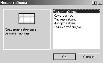 У вікні База данных натискаємо кнопку Создать. Реакцією системи на цю дію буде виведення на екран вікна Новая таблица, яке зображено на мал. 10. У цьому вікні перераховані такі способи створення таблиць: Режим таблицы, Конструктор, Мастер таблиц, Импорт таблиц, Связь с таблицами. Режим таблицы видає бланк (форму) абстрактної таблиці. Потім вона може приймати конкретне наповнення і вміст. Робота Мастера таблиц заснована на використанні заголовків таблиць, з яких користувач вибирає поле для своєї нової таблиці. Звичайно, передбачувані заготовки полегшують роботу користувача, але вони не вирішують всіх життєвих випадків. Та й навряд чи будь-яка, навіть хороша, заготовка може повністю задовольнити потреби та запити всіх користувачів. Спосіб Импорт таблиц дозволяє імпортувати дані у таблицю, яка створюється, з інших файлів, у тому числі і з файлів форматів даних, які відрізняються від формату, який використовується СУБД Access. Спосіб Связь с таблицами дозволяє шляхом установлення зв'язків з файлом формату інтегрувати дві інформаційні системи. З усіх способів створення таблиць, на наш погляд, найзручнішим є спосіб (режим), який називають Конструктор. Він особливо зручний на етапі початкового вивчення СУБД Acсess. Саме цим способом ми і будемо користуватися.
