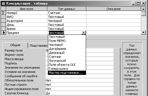 Розв'яжемо таку задачу: поле Предмет з таблиці Список підставимо у таблицю Консультация. Ця задача може бути вирішена так. У вікні бази даних файла Basa2 відкриємо структуру таблиці Консультация у режимі конструктора. У цій структурі створюємо ще одне поле з будь-яким іменем. Використовуватимемо ім'я Предмет. Далі відкриємо значення Тип данных, де останнім є рядок Майстер підстановок (мал. 23.).