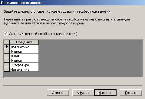 Після перенесення поля Предмет необхідно натиснути кнопку Далее. 4. Вміст вікна Мастер подстановок знову змінюється і набирає вигляду, показаного на малюнку 26.У цьому вікні можна відрегулювати ширину стовпців (у даному випадку стовпця Предмет). Для цього мишу встановлюють в область заголовка поля так, щоб курсор набрав такого вигляду, який він має на мал. 26. Після цього натискують клавішу миші, і миша переміщується по поверхні столу до досягнення необхідної ширини поля. Потім клавішу відпускають і натискають кнопку Далее. 5. Вікно майстра підстановок набирає тепер вигляду, який зображено на мал. 27. У цьому вікні потрібно задати підпис для стовпця підстановки. Залишимо те саме слово - Предмет і натиснемо кнопку Готово. Після цього на екрані з'явиться вікно Мастер подстановок, у якому необхідно підтвердити необхідність збереження таблиці, тобто натиснути кнопку Да. У результаті виконаних дій з'явиться вікно, зображене на мал. 28. Зверніть увагу, що у результаті виконаних операцій у структурі таблиці Консультация з'явиться не ім'я поля Предмет, а ім'я ключового поля таблиці Список (у даному випадку ім'я Номер 1). Це і означає, що таблиця Список і таблиця Консультация зв'язані по цьому полю. Слід звернути увагу на те, що змінився тип поля, а на вкладці Подстановка наведені характеристики того поля, яке приєднується до Консультации. Закрийте вікно структури таблиці Консультация і відкрийте її для перегляду. Зазначимо, що у цій таблиці з’явиться поле Предмет. Клацніть кнопкою миші в позиції першого рядка цього поля і розкрийте список його значень. Вікно набере вигляду, зображеного на мал. 29.
