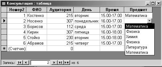 Переконайтесь у тому, що у даному списку зберігаються всі значення поля Предмет зв'язаної таблиці Список. Тепер кожне з цих значень може бути перенесено у поточну комірку поля Предмет.
