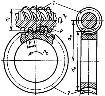 ЧЕРВЯЧНЫЕ ПЕРЕДАЧИ Червячная передача (рис. 3.1) служит для передачи механической энергии между перекрещивающимися валами. Червячную передачу относят к зубчато-винтовым передачам, имеющих характерные черты зубчатых и винтовых передач. Она состоит из червяка 1 и червячного колеса 2. Червяк представляет из себя винт со специальной резьбой, червячной колесо – это зубчатое колесо с зубьями, нарезанными по дуге. Изобретение червячной передачи приписывают Архимеду.