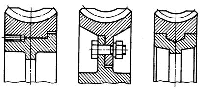 Червячные колеса небольшого диаметра (до 100-120 мм) выполняют цельными. Более крупные колеса изготавливают сборными для экономии дорогостоящих бронз. Диск колеса выполняют из более дешевых чугуна или стали. Чаще всего изготавливают бандажированные колеса (рис. 3.6 а). Червячный венец выполняют поковкой и напрессовывают на диск. Для гарантии непроворачиваемости венца, его дополнительно фиксируют винтами или штифтами в качестве цилиндрической шпонки. Иногда венец получают заливкой на ступицу (рис. 3.6 в). Для гарантии непроворачиваемости на ободе диска выполняют несколько неглубоких отверстий или ступенек. Фланцевое крепление венца к диску (рис. 3.6 б) применяют при больших диаметрах колеса. Венец крепят с помощью призонных болтов (под развертку) или заклепок. Нарезание зубьев червячного колеса выполняют после сборки.