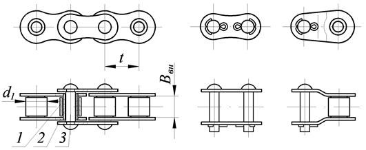 Роликовые цепи типа ПР (ГОСТ 13568-97) (рис. 5.2) имеют наибольшее применение. Каждое звено (рис. 5.2 а) выполнено из двух пластин, напрессованные на валики 3 (наружное звено) или на втулки 2 (внутреннее звено). Втулки надеты на валики и образуют шарниры. Втулки, свою очередь, несут ролики 1, которые входят во впадины между зубьями звездочек. Благодаря роликам трение скольжения между цепью и звездочкой заменяется трением качения, что уменьшает износ зубьев звездочки. Концы валиков расклепывают, поэтому звенья цепи неразъемны. Концы цепи соединяют соединительными звеньями (рис. 5.2 б) с закреплением валиков шплинтами или расклепыванием. В случае необходимости использования цепи с нечетным числом звеньев применяют специальные переходные звенья (рис. 5.2 в), которые, однако, слабее, чем основные, поэтому стараются избежать применения переходного звена.