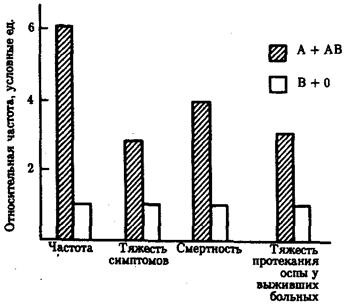 Рис. 12.10. Относительная частота и показатели тяжести заболевания «натуральной» оспой у лиц с разными группами крови АВО