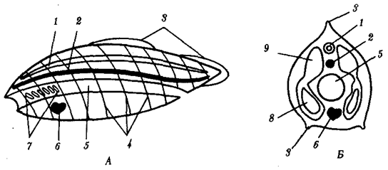 Рис. 13.14. Общий план строения хордового животного. А — вид сбоку; Б — поперечный срез: 1 —нервная трубка, 2— хорда, 3— плавники, 4— сегменты тела, 5—пищеварительная трубка, 6— пульсирующий сосуд или сердце. 7—жаберные щели в глотке, 8— целом, 9— сомит