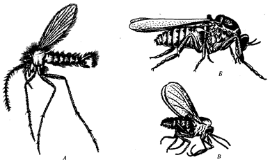 Рис. 21.14. Мелкие кровососущие двукрылые. А — москит; Б — мошка; В — мокрец Борьба с москитами должна вестись комплексно и быть направленной на уничтожение природных очагов лейшманиозов и других трансмиссивных заболеваний: это уничтожение грызунов и мест выплода москитов, обработка инсектицидами поверхностей в хозяйственных постройках и жилищах. Эффективны также индивидуальные средства защиты от укусов. Мошки (сем. Simuliidae). Мелкие кровососущие насекомые длиной 2—6 мм. Ротовой аппарат короткий и очень мощный, предназначен для прокалывания кожи и слизывания крови. Крылья прозрачны, без пятен, конечности короткие и толстые (рис. 21.14, Б). Распространены повсеместно, но особую опасность представляют в Африке и тропической Америке, где являются переносчиками возбудителей онхоцеркоза. Интересно, что мошки кусают человека и животных преимущественно в бедра и боковые поверхности туловища. Именно в этих областях скапливаются микрофилярии онхоцерков, что значительно увеличивает вероятность их передачи. В большом количестве мошки встречаются поблизости от ручьев и речек с быстрым течением, чистой и прохладной водой. На дне таких водоемов самки откладывают яйца, из которых выходят личинки, ведущие прикрепленный и малоподвижный образ жизни. Через 2—3 недели формируется куколка, и еще через 1 неделю из ее оболочки выходят взрослые мошки. Развитие их идет синхронно, и огромное количество мошек на больших территориях появляются одновременно. Одним из наиболее экологически чистых методов борьбы с мошками является механическая очистка зон особенно быстрого течения рек и ручьев, где на дне и лежащих предметах скапливаются личинки мошек. При этом они отрываются от места прикрепления и уносятся течением. Многие из них при этом гибнут или поедаются различными хищниками. В редких случаях в очагах онхоцеркоза при высокой концентрации личинок мошек на небольших площадях возможно применение инсектицидов. Мокрецы (сем. Ceratopogonidae). Самые мелкие из кровососущих двукрылых. Их размеры от 1 до 4 мм. Большинство видов имеют пятнистые крылья, длинные многочленистые усики и колюще-сосущий хоботок (рис. 21.14, В). Обитают повсеместно, но так же, как мошки, в тропиках являются переносчиками возбудителей некоторых филяриатозов. Размножаются мокрецы в небольших стоячих водоемах или во влажной почве. Развитие от яйца до имагинальной стадии продолжается около 1 мес. На человека нападают преимущественно при высокой влажности воздуха или во время дождя. Против мокрецов наиболее эффективны индивидуальные средства защиты. Слепни (сем. Tabanidae) — наиболее крупные кровососущие двукрылые, до 30 мм длиной. Общим видом напоминают крупных мух. Ротовой аппарат сочетает в себе черты колюще-сосущего и лижущего.