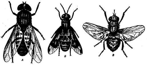 Рис. 21.15. Крупные кровососущие двукрылые. А — слепень Tabanus sp.; Б — слепень Chrysophthalmus sp.; В — муха осенняя жигалка