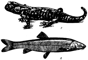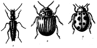 Рис. 23.3. Пассивноядовитые животные. А— жук стафилин береговой; Б— колорадский жук; В — бахчевая коровка; Г— саламандра огненная; Д— маринка балхашская