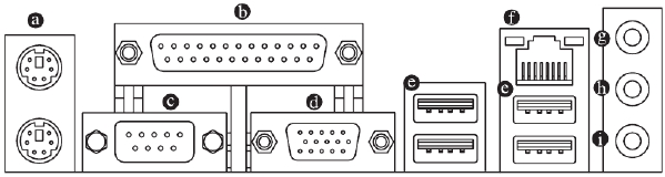 a) PS/2 Keyboard and PS/2 Mouse Port b) Parallel Port c) Serial Port d) D-Sub Port e) USB Port f) RJ-45 LAN Port g) Линейный аудио вход (синий) h) Линейный аудио выход (салатовый) i) Разъем микрофона (розовый)