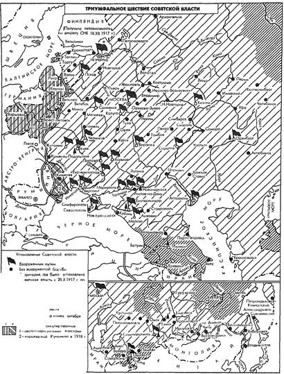 чать всеобщую забастовку. 28 октября были расстреляны солдаты, охранявшие кремлевский Арсенал. Всеобщая стачка переросла в вооруженное восстание. 2 ноября Комитет общественной безопасности капитулировал. Власть перешла к ВРК. (Э) Каковы особенности установления советской власти в Москве? В Центральном промышленном районе советская власть установилась еще до ее победы в двух столицах России. @ Чем это можно объяснить? В Центрально-Черноземном районе власть большевиков установилась лишь к концу января 1918 г. gs Почему? Чем объяснить, что в Донбассе, на Урале, в Баку и городах Поволжья большевики пришли к власти сразу о/се после известия о победе своих товарищей в Петрограде? В 79 городах России из 97 советская власть установилась мирным путем. В национальных окраинах установление большевистской власти проходило в ожесточенной борьбе с буржуазными националистами. (9) В чем противоречия деклараций советской власти и желаний националистов? Решающее значение в установлении советской власти в национальных окраинах оказывали воинские части, находившиеся под влиянием большевиков (в Прибалтике — латышские стрелки, Финляндии — Красная Армия и т.п.) и революционные отряды из центральных районов России, особенно балтийские моряки. Широко применялся красный террор, всеобщие забастовки рабочих. В целях ослабления сопротивления советской власти на местах создавались «самостоятельные и независимые» советские республики. (f) Какие советские республики были образованы в период с октября по март 1918 г.? Этот период Ленин охарактеризовал как «триумфальное шествие Советской власти». Основные события и даты Шестой съезд РСДРП(б) — 26 июля—3 августа 1917 г. Демократические совещания в Москве — 12 августа и 14 сентября 1917 г. Освобождение из «Крестов» группы социал-демократов, арестованных в июльские дни — Троцкого, Каменева, Луначарского и др. — 2 сентября 1917 г. Установление советской власти в Москве — 25 октября (7 ноября)-3(16) ноября 1917 г. II Всероссийский съезд Советов рабочих и солдатских депутатов — 25—26 октября (7—8 ноября) 1917 г. «Триумфальное шествие Советской власти» — октябрь 1917— февраль 1918 г. Контрольные вопросы 1. Почему большевики взяли курс на вооруженное восстание? 2. Каковы были условия политического компромисса? 3. Основы ленинского плана захвата власти. 4. Какова роль Советов в организации и проведении восстания? 5. Правомочны ли решения II Всероссийского съезда Советов рабочих и солдатских депутатов? 6. Чем объяснить «триумфальное шествие» советской власти? Источники и литература Антонов-Овсеенко В.А. В семнадцатом году. Киев, 1991. Арутюнов А. Феномен Владимира Ульянова (Ленина). М., 1992. Ленин В.И. Слухи о заговоре. Политическое положение и др..// Он же. ПСС. Т. 34. Милюков П. Революция глазами ее руководителей. М., 1991. Октябрьская революция: Мемуары. М., 1991. Октябрьский переворот. М., 1991. Раскольников Ф.Ф. Кронштадт и Питер в 1917 году. М., 1990. Рабинович А. Большевики приходят к власти: Революция 1917 года в Петрограде. М, 1989. Революция 1917 года глазами ее руководителей. М., 1991. Садулъ Ж. Записки о большевистской революции. М., 1990. Слассер Р. Сталин в 1917 году: Человек, который прозевал революцию. М., 1989. Троцкий Л. К истории русской революции. М., 1990. Проблемы для самостоятельного изучения 1. Вооруженное восстание — одна из форм борьбы за власть. 2. Компромисс социалистически
