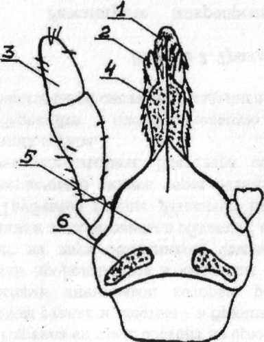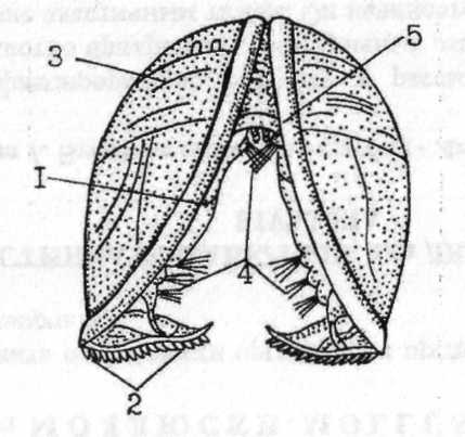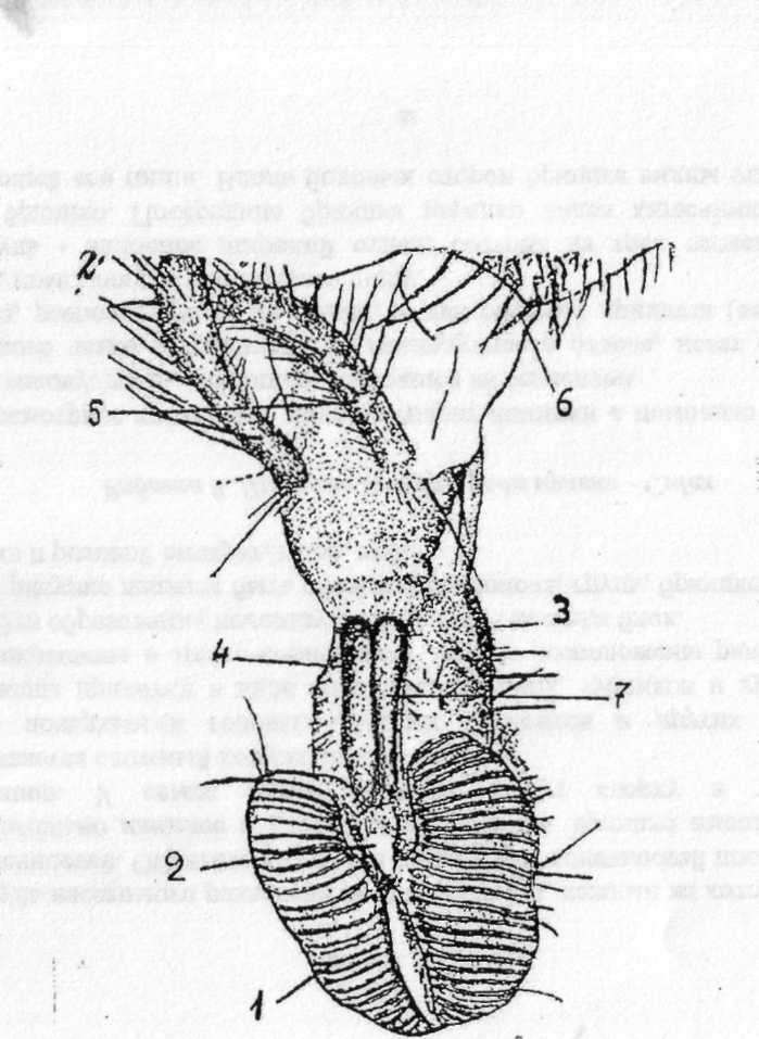 Рис. 67. Головная вошь (самец): 1 - головка; 2 - грудь; 3 - брюшко; 4 - усики: 5 - стигма Голова, имеющая яйцевидную форму, хорошо отграничена от грудного отдела. По бокам головы найдите короткие членистые усики, а позади них -простые глаза. Ротовой аппарат вши втянут внутрь и на препарате не виден. Грудной отдел не расчленен на сегменты и не отделен резко от брюшка. По бокам груди найдите конечности (сосчитайте их и сравните с количеством ног у представителей класса паукообразных). Обратите внимание на последний членик ходильной конечности. Он отличается крупными размерами и несет коготок. Предпоследний членик, в свою очередь, имеет выступ, расположенный напротив коготка. Вместе с коготком он образует подобие клешни, с помощью которой вошь прочно удерживается на волосах. Брюшко расчленено на десять сегментов, но два из них сильно редуцированы. Наружные края сегментов имеют форму фестонов и пигментированы. На темном фоне часто хорошо видны стигмы (дыхательные отверстия) и отходящие от них трахейные трубочки, впадающие в основные трахейные стволы. Определите пол вши. У самки на заднем конце брюшка находятся два серповидных придатка (гоноподы). У самца сквозь задние сегменты просвечивает копулятивный аппарат, по форме напоминающий треугольник. Зарисуйте препарат. На рисунке обозначьте: головку, усики, глаза, грудь, ходильные конечности (указать число), брюшко, стигмы и трахеи, гоноподы (у самки), копулятивный орган (у самца). Грудь насекомого разделена на три сегмента, каждый из которых несет по паре конечностей. Обратите внимание на размеры конечностей последней пары: они значительно длиннее и служат для прыганья. Брюшко имеет отчетливую сегментацию. У самца конец брюшка загнут кверху и через хитин просвечивается сложный копулятивный орган. На поверхности головы, грудных сегментов и других частей тела расположены придатки в виде волосков, щетинок, зубчиков и зубцов. Зубцы обычно окрашены в желто-коричневый цвет и расположены рядами, образуя гребни. Эти образования используются для систематики блох. На рисунке должны быть обозначены: голова, грудь, брюшко, третья пара ног, усики и ротовой аппарат, глаза, зубцы. Работа 8. Личинка комара рода кулекс - Culex Рассмотрите тотальный микропрепарат личинки с помощью микроскопа. Найдите голову, грудь и брюшко, состоящее из сегментов. Голова четко отграничена от последующего отдела, несет пару усиков, пару глаз, расположенных по бокам, и два ротовых придатка (веерообразные опахала), помогающие захватывать пищу. Грудь - наиболее широкий отдел, состоит из трех сегментов, за ней следует брюшко. Посередине брюшка нередко виден кишечник, темный от заполняющей его пищи. Вдоль боковых сторон брюшка видны стволы трахей.
