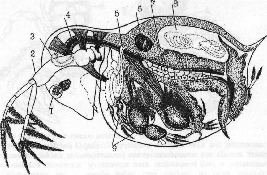 Зарисуйте строение тела дафнии. Тело дафнии сплющено с боков и заключено в двустворчатую прозрачную раковину, сквозь которую просвечиваются внутренние органы (раковина прикрывает только грудной и брюшной отделы).