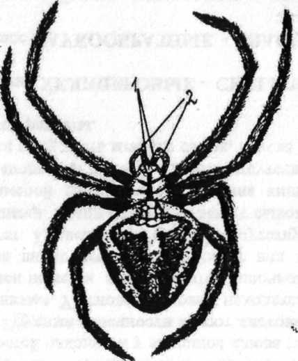 На заднем конце тела найдите шипики, на переднем конце - голову с загибающимся на брюшную сторону клювом. На голове рассмотрите большой сложный глаз черного цвета и рядом маленький в виде пятнышка простой глаз (науплиусов глазок). Это непарные глаза. Конечности дафнии: на голове располагаются ветвящиеся усики - это вторая пара конечностей - антенны, выполняющие двигательную функцию. Первая пара конечностей находится у вершины клюва (эти конечности короткие и не расчлененные). Грудные конечности имеют листовидную форму и покрыты полосками или щетинками. У основания ножек находятся жабры. Брюшной отдел лишен ножек и заканчивается вилочкой. На спинной стороне в передней части тела видно сердце. Оно имеет вид небольшого мешочка и постоянно пульсирует. Кровеносные сосуды отсутствуют, кровь движется по лакунам между органами. Кзади от сердца лежит выводковая камера с яйцами. Под выводковой камерой располагается средняя кишка, а по бокам кишки половые железы. Выводковая камера у самца отсутствует. Самцы отличаются еще и тем, что они на одну треть меньше самок, голова без клювика, антеннулы дкучленисты и хорошо развиты. Подтип ХЕЛИЦЕРОВЫЕ - CHELICERATA Класс ПАУКООБРАЗНЫЕ - ARACHNIDA Цель - изучить общую характеристику класса паукообразных и особенности представителей отрядов, имеющих ветеринарное значение. Работа 1. Скорпион - Buthus eupeus Изучение внешней морфологии скорпиона следует начать с рассмотрения животного со спинной стороны. Обращает на себя внимание уплощенная форма тела - черта, связанная с жизнью скорпиона под камнями и в щелях. Тело скорпиона разделяется на небольшую, покрытую общим хитиновым щитом головогрудь и длинное сегментированное брюшко. Брюшко подразделяется на широкое семичлениковое переднебрюшие и суженное пятичлениковое заднебрюшие, заканчивающееся вздутым тельсоном - анальной лопастью. Примерно посредине головогруди расположена пара крупных глаз (рассматривать с помощью лупы). Близ каждого переднего угла щита головогруди лежит группа из пяти маленьких боковых глаз (рассматривать с помощью лупы). Головогрудь несет шесть пар конечностей. Первая пара - хелицеры (гомолог антенн ракообразных). Хелицеры небольших размеров, лежат впереди и над ротовым отверстием. Толстый основной членик хелицеры заканчивается маленькой клешней с зазубренными хитинизированными краями. Хелицеры играют роль верхних челюстей, с помощью которых добыча разрывается, измельчается И обильно смоченная выделяющимся наружу пищеварительным соком поглощается (всасывается) скорпионом.