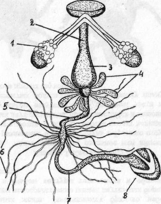 Глохидии развиваются в наружных жабрах материнского организма, которые при этом сильно вздуваются. Если обнаружится животное с такими жабрами, то вскрывают их и из вытекающей коричневой жидкости готовят препарат. Рассматривают его под микроскопом. Обращают внимание на двустворчатую раковину. На свободных брюшных краях ее сидят зубцы, покрытые мелкими зубчиками. Находят замыкательный мускул, соединяющий обе створки, а также нить биссуса. Глохидии ведут паразитический образ жизни, прикрепляясь к телу рыбы. Такие особенности в их строении, как наличие зубцов (крючочков), зубчиков и биссусовой нити, является приспособлением для прикрепления к телу хозяина. Наличие замыкательного мускула дает возможность личинке широко раскрывать свои створки и хлопать ими, в результате чего она плавает скачками. Класс БРЮХОНОГИЕ - GASTROPODA К этому классу относятся моллюски, у которых мантийная полость со всем комплексом ее органов (анальное отверстие, отверстие почек, органы дыхания и др.) лежит впереди, над головой, или сбоку. Для большинства брюхоногих характерна асимметрия тела. Раковина либо конусовидная с вершиной, склоненной назад, либо завита в спираль. У части наземных и пресноводных брюхоногих, образующих подкласс легочных, жабра заменена "легким" - участком мантии, обильно снабженным ветвящимися кровеносными сосудами. Одним из представителей класса брюхоногих является виноградная улитка Helix pomatia. Работа 4. Половая система виноградной улитки- Helix pomatia Виноградная улитка, как все легочные брюхоногие, гермафродит. Половая система очень сложная, главным образом из-за наличия целого ряда дополнительных желез. Основная часть половой системы - гермафродитная железа, в которой образуются и яйцеклетки и сперматозоиды. От этой железы отходит гермафродитный проток, делящийся на мужской и женский протоки, которые на большом протяжении внешне слиты. В начальную часть женского протока открывается белковая железа, выделяющая слизистое вещество, которое одевает яйцо, в конечную часть - проток семяприемника и пальчатые железы, образующие скорлупу яйца. Мужской проток впадает в совокупительный орган, который открывается в небольшую полость перед наружным половым отверстием. В эту же полость открывается и конечная часть женского протока - влагалища. С совокупительным органом связан тонкий трубчатый придаток - бич, секрет которого облекает большие массы сперматозоидов, образуя сперматофоры. Кроме того, в конечную часть половой системы открывается мешок "любовных стрел", в котором образуются известковые тельца - "любовные стрелы" При копуляции они втыкаются в кожу партнера и служат, по-видимому, для раздражения. Каждая из участвующих в копуляции особей вводит сперматофор во влагалище другой особи.