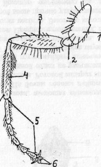 При малом увеличении микроскопа рассмотрите и зарисуйте все членики конечности: тазик, вертлуг, бедро, голень, лапку. На последнем членике ноги -лапке - изучите приспособление для передвижения мухи по вертикальной поверхности. Это приспособление состоит из двух подушечек с железистыми волокнами. На последнем членике лапки имеются также, два коготка, которыми она цепляется за неровную поверхность.