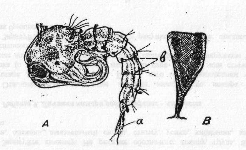 Рис. 71. Куколка комара: А - куколка кулекс: а - хвостовые пластинки; в- шипы; В - дыхательная трубочка куколки анофелоса