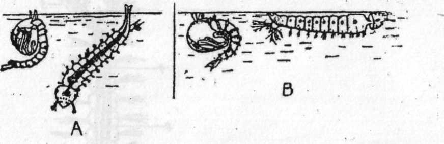 Рис. 72. Личинки и куколки комаров в позе покоя: А - комара кулекс: В - комара анофелес