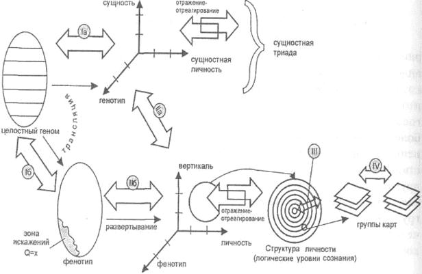 - развертывание фенотипа в текущую триаду также может сопровождаться определенными искажениями, которые порождают два рода близких дефектов и, соответственно, два рода неконгруэнтностей; здесь при классификации удобнее идти от последних -неконгруэнтности между сущностной и текущей триадами (рис. 64, 2а) связаны с сущностными дефектами трансляции; неконгруэнтности между фенотипом и текущей триадой, главным образом, между фенотипом и вертикалью (рис. 64, 2б) связаны с текущими дефектами трансляции, структура личности формируется в процессе отражения-отреагирования на базе вертикали «тело-душа-дух»; дефекты, возникающие на этом этапе формирования структуры, могут быть подразделены на межуровневые, порождающие межуровневые неконгруэнтности (рис. 64, III), таковы рассмотренные нами выше несоответствия между базовыми картами и патологическими стратегиями, и внутриуровневые, например, порождающие неконгруэнтности между группами карт (рис. 64, IV) [62]. Важно помнить, и это очевидно следует из нашего описания, что любая неконгруэнтность есть следствие определенного рода структурного напряжения, свидетельство структурного конфликта. При таком подходе понятие неконгруэнтности становится не просто интуитивно ясным, но хорошо работающим на практике инструментом. Мы всегда можем не просто зафиксировать некоторое несоответствие, но проследить его генезис, истоки, развитие и наметить пути возможной коррекции. К примеру, вы наблюдаете человека плотного телосложения, с большой бородой, мощными руками и ногами (классический «русский мужик»), одетого в скромный мешковатый костюм, который неожиданно начинает говорить тонким высоким голосом, причем речь идет о концептуальных вопросах четвертого и пятого логических уровней. Он торопится, предъявляется масса дигитальной болтовни, сопровождаемой оживленной жестикуляцией. Налицо неконгруэнтность, но какого рода? Выделенные нашим вниманием признаки по своей природе различны: это и особенности конституции (телосложение, голос, жесты), и стилевые признаки (одежда, прическа), и особенности вербализации (речь) и т. д. Что взять за основу? Базовым несоответствием здесь представляется неконгруэнтность между кинестетическим телосложением и характеристиками голоса; другие важные моменты - неконгруэнтности между логическим уровнем, на котором, якобы, ведется беседа, и дигитальностью высказываний, оживленной жестикуляцией и т. д. В результате мы можем предположить наличие глубинных несоответствий между сущностной и текущей триадами, а также конфликты на уровне космограммы и карт, карт и периферии и карт между собой. Именно о такого рода структурных неконгруэнтностях мы и говорим. Итак, неконгруэнтности могут быть отнесены к дефектам любого логического уровня. Все же на практике они чаще всего соотносимы с дефектами карт. Так происходит не потому, что дефекты карт превалируют над всеми другими или могут быть изолированы от других логических уровней, - просто именно структура уровня убеждений в наибольшей степени ответственна за социальное поведение, «внешнюю» деятельность, вербализацию и т. д. На этом уровне вектор внимания равномерно разделен между «внешним» и «внутренним» пространством, и он представляет собой как бы центральный коммуникатор всей системы логических уровней сознания. Здесь с