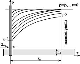 Постоянный дебит. Будем считать дебит скважины постоянным. Пьезометрические кривые падения давления для разных моментов времени показаны на рис. 4.5. С некоторого момента смещение во времени пьезометрической кривой для закрытого пласта происходит так, что все точки её опускаются на одно и тоже расстояние d, т.е. во всех точках пласта давление падает с одной скоростью.