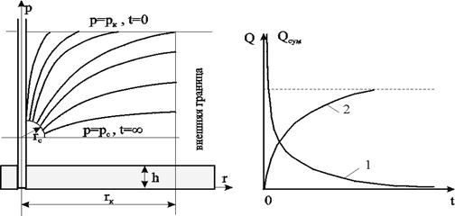 а объем жидкости Vf, добытой из скважины (в пластовых условиях) за время t с момента пуска скважины равен При больших параметрах Фурье fo объем Vf оказывается равным упругому запасу жидкости в закрытом пласте Vf» tb* (рк - рс). (4.28) На рис. 4.6 показана пьезометрическая кривая для нескольких моментов времени в закрытом пласте, а на рис. 4.7 изображены две кривые: одна из них характеризует падение дебита скважины с постоянным забойным давлением (кр. 1); другая – рост суммарной добычи жидкости Vf (кр.2).
