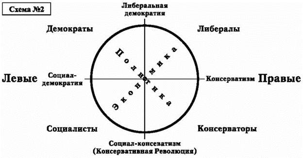Здесь центром является то, что в либеральной схеме является антицентро м. Справа от евразийского центра находится политический фундаментальный консерватизм, слева – экономический социализм. В крайне правом секторе – рыночная экономика, в крайне левом – политическая демократия. Точка либеральной демократии становится в таком случае антицентром, ее не существует в принципе, и все попытки ее установить, придать ей политическое и идеологическое содержание будут приводить к адекватным мерам со стороны евразийского центра – точно так же, происходит в обратно симметричной либеральной схеме. Примечания 1 В данном случае речь идет об изначальной политической модели с учетом классических "правых" – традиционалистов, аристократов, консерваторов, а не об экономической версии, где на "правом" фланге стоят либералы. >>