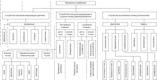 Выше указывалось, что первым и главным признаком автоматического действия рабочей машины является переход функций управления от человека к самой машине. Осуществление процесса управления заключается в том, что человек, наблюдая за работой машины и анализируя ее выполнение, делает вывод о необходимости того или иного вмешательства в протекающий заданный технологический процесс и осуществляет необходимые для этого действия. Например, токарь, выполняя обработку детали на станке, следит за перемещением резца автоматически движущимся суппортом вдоль обрабатываемой поверхности и, когда обработка данной поверхности закончена, отводит суппорт и возвращает его в исходное положение, которое он имел до начала обработки, или переводит его в начальное положение для обработки следующей поверхности. При автоматизации процесса вышеперечисленные функции управления должны выполняться самим станком. Для этого прежде всего необходимо иметь на станке устройство, которое, следя за перемещением резца, т. е. измеряя это перемещение, установило бы момент окончания заданного перемещения и подало бы об этом соответствующий сигнал, например замкнуло бы определенную электрическую цепь. Это устройство получения информации носит обычно название “датчик”. Сигнал, поступающий от датчика, может быть слишком слаб для того, чтобы привести в действие устройства для осуществления управления станком, в данном случае для отвода и перемещения суппорта. Поэтому поступивший от датчика сигнал перерабатывается в устройствах обработки информации и выдачи команды, которые носят обобщенное название “преобразователи”. Команду, поступившую от преобразователя, выполняют, т. е. осуществляют те или иные действия и перемещения, устройства осуществления команд – “исполнители”. Из рассмотрения элементарного примера обработки на станке следует, что механизм управления состоит из трех основных частей: 1) устройства получения информации – датчика, 2) устройства обработки информации и выдачи команды – преобразователя и 3) устройства выполнения команды – исполнителя. Таблица 3 Структуры управления