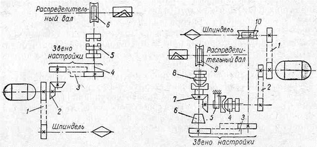 Принципиальная схема простейшей машины с распределительным валом приведена на рис. 2. Распределительный вал здесь служит для выполнения всех рабочих и холостых ходов рабочего цикла. От двигателя движение передается шпинделю через передачу 1 и распределительному валу через коническую передачу 2, звено настройки 8, вал 4, кулачковую муфту 5 и червячную передачу 6. Так как распределительный вал имеет только одну цепь для своего вращения, то количество оборотов вала в минуту для данной настройки будет постоянным. Набор сменных зубчатых колес позволяет при настройке выбрать из ряда скоростей вращения ту, которая соответствует длительности технологического цикла. Включение и выключение распределительного вала осуществляются независимо от вращения шпинделя переключением муфты 5. К автоматам этой группы относятся почти все неметаллорежущие машины – пищевые, текстильные, химические, сельскохозяйственные, полиграфические, а также металлорежущие автоматы для нетрудоемких работ, автоматы продольного точения и пр. Особенностью автоматов этого типа является то, что кулачки, обеспечивающие холостые хода, для определенного круга работ являются постоянными и требуют определенного постоянного угла поворота распределительного вала, в то время как кулачки, обеспечивающие рабочие хода, в зависимости от характера работы в каждом отдельном случае требуют различных долей поворота распределительного вала. Поэтому при очень длительных работах время на холостые хода также будет велико. С другой стороны, при малой продолжительности обработки детали время на холостые хода может быть меньше допускаемого прочностью механизмов. С целью устранения вышеуказанного недостатка вводят две скорости вращения для распределительного вала. Это применяется там, где имеется возможность сгруппировать холостые хода отдельно от рабочих. Тогда часть оборота, отведенную для рабочих ходов, распределительный вал выполняет на малой скорости, а остальную часть оборота – на повышенной скорости. У автоматов такого типа движение от привода передается шпинделю через передачу 1 (рис. 3), а распределительный вал получает медленное и быстрое вращение. Медленное вращение передается от шпинделя через червячную передачу 10, сменные зубчатые колеса звена настройки 3, муфту обгона 6, фрикционную муфту рабочего хода 8 и червячную передачу 9. Быстрое вращение распределительного вала осуществляется от главного привода через постоянные зубчатые колеса 2, фрикционную муфту 4, коническую зубчатую передачу 7, фрикционную муфту 8 и червячную передачу 9. Переход от медленного вращения распределительного вала к быстрому, а также от быстрого к медленному производится переключением муфты 4 при включенной муфте 8. Быстрое уменьшение скорости вращения червячного вала до рабочей скорости достигается тем, что при выключении муфты 4 немедленно включается тормоз 5. В некоторых системах управления одни действия выполняются в течение технологического цикла один раз, а другие повторяются многократно. Например, в револьверных автоматах зажим и подача прутка, а также перемещение поперечных суппортов производятся один раз, а поворот револьверной головки и подача револьверного суппорта повторяются несколько раз за цикл. Если иметь один распределительный вал, то на долю каждого действия