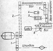 Рис. 4. Схема автомата с распределительным и вспомогательным валами. Вспомогательный вал получает движение от главного привода через передачу 2, а шпиндель – через передачу 1. От вспомогательного вала движение передается распределительному валу через звено настройки 5 со сменными зубчатыми колесами, червячную 8 и коническую 6 передачи. Тем самым можно получить требуемую различную скорость распределительного вала, связанного с валом, несущим кулачок 4 револьверной головки, при постоянной скорости вспомогательного. На линиях с централизованным управлением контроль исполнения предыдущих команд не осуществляется, хотя и может быть заблокирован. Системы автоматического управления часто выполняются по рефлекторному принципу. При этом по достижении заданного положения рабочий орган станка (суппорт, силовая головка, стол и т. д.) оказывает воздействие на элемент управления. В качестве такого элемента при электрической системе управления используются путевые выключатели, при гидравлической и пневматической – пилотные клапаны и при механической – падающие червяки и муфты. Такая система в литературе обычно называется системой путевого контроля, однако правильнее ее назвать рефлекторной, так как в отдельных узлах схем применяется автоматическое управление давлением, скоростью, фактическим размером обрабатываемого изделия и т. п., т. е. командный импульс может поступить не только от положения рабочих органов. Управление давлением применяется, например, в зажимных устройствах (при работе до жесткого упора) и в системах смазки. Элементом управления в этом случае является реле давления. Управление скоростью применяется при автоматизации процессов торможения асинхронных двигателей, для контроля вращения режущего инструмента и контроля снижения скорости при индексации (фиксированный останов стола, шпинделя). Управление осуществляется при помощи реле скорости. Рефлекторная система широко используется в автоматических станочных линиях. Все элементы линии связаны между собой таким образом, что каждое последующее движение отдельных механизмов может быть произведено лишь после выполнения предыдущих. Так, освобождение деталей от зажима может произойти только после того, как все головки полностью совершают свой рабочий цикл и вернутся в исходное положение. Кроме того, транспортер, перемещающий детали, также должен находиться в исходном положении. Перемещение деталей транспортером вперед возможно только тогда, когда все детали отжаты и все силовые головки, работающие на линии, находятся в исходном положении. Зажим деталей может быть произведен после перемещения деталей на следующую позицию и только в том случае, когда транспортер дошел до своего переднего крайнего положения. Пуск силовых головок вперед возможен только тогда, когда все детали зажаты и т. п. Рефлекторные системы обладают высокой надежностью, так как команды подаются непосредственно от рабочих органов, что исключает возможность аварий. Однако рефлекторные системы управления имеют и определенные недостатки. Рефлекторные системы значительно сложнее, имеют больше цепей управления. Датчики для подачи командных сигналов по большей части приходится располагать в рабочей зоне агрегатов; они оказываются подверженными действию, охлаждающих и смазывающих жи