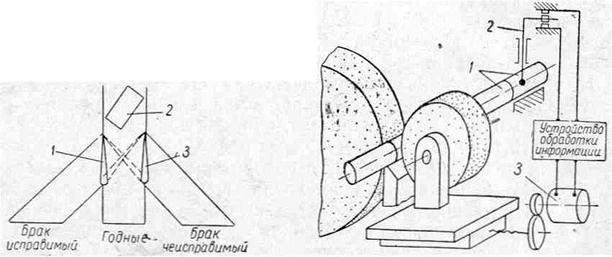 Простейшим примером, поясняющим действие механизма управления во втором случае, когда требуется осуществить выбор команды, является работа сортировочного механизма контрольного автомата (рис. 7). Размеры контролируемых деталей 2 проверяются размерными датчиками на измерительной позиции контрольного автомата. В зависимости от величины контролируемого размера могут последовать три различные команды: 1) отключить правую заслонку 3, если размер меньше нижнего – допустимого предела, т. е. брак неисправимый; 2) отклонить левую заслонку 1, если контролируемый размер больше верхнего допустимого предела, т. е. брак исправимый и 3) оставить обе заслонки в исходном положении, если размер лежит в допустимых пределах, т. е. деталь годная. Как в первом, так и во втором случае может появиться необходимость подачи команды либо на каждый рабочий цикл, либо вне циклов – по общим условиям течения технологического процесса. Примером внециклового устройства обработки информации без выбора команды могут служить некоторые конструкции автоматических под наладчиков. На рис. 8 показана принципиальная схема автоподналадки на бесцентрово-шлифовальном станке. Обработанные на станке изделия 1 поступают на контрольную позицию шлифовального станка, где размерным датчиком 2 проверяется величина их наружного диаметра, прошлифованного на станке. Если в процессе работы шлифующий круг износится и размеры изделий увеличатся до опасной величины, размерный датчик подаст соответствующий сигнал. Сигнал размерного датчика преобразовывается в устройстве обработки информации в команду на вращение исполнительного электродвигателя 3, перемещающего по- дающую бабку по направлению к шлифующему кругу, что уменьшает наружный диаметр шлифуемых валиков до требуемой величины. Устройства обработки информации в случаях, когда выбор команды не требуется, представляют собой чаще всего усилители либо (реже) замедлители. Устройства обработки информации с выбором команды требуют выполнения сравнения или вычисления и должны быть соответствующим образом оборудованы. В приведенном выше примере с открыванием заслонок в сортирующем механизме контрольного автомата в устройстве обработки информации происходит сравнение контролируемого размера с заданными пределами допуска, т. е. в обычном или скрытом виде имеется в наличии сравнивающее устройство. Цикловые устройства обработки информации без выбора команды являются характерными для временных автоматов. Внецикловые устройства обработки информации без выбора команды и цикловые с выбором команды, оборудованные сравнивающими устройствами, чаще всего бывают у рефлекторных автоматов (см. табл. 3). Цикловые и внецикловые устройства обработки информации, осуществляющие вычисление для выбора и подачи команды, применяются в наивысших типах самонастраивающихся рабочих автоматических машин. Исполнительные двигатели и исполнительные устройства (см. табл. 3) могут быть электрическими, гидравлическими и пневматическими. К электрическим исполнительным устройствам относятся электродвигатели, электромагниты и электромагнитные муфты. Чаще всего применяются обычные электродвигатели переменного тока. В последнее время в схемах управления начинают широко применяться так называемые шаговые электродвигатели всевозможных 