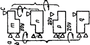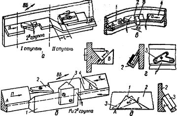 Большинство плоских деталей вписываются контуром в четырехугольник или треугольник и при выходе из бункера могут иметь 2, 4, б или 8 различимых положения (рис. 37). Детали в виде прямоугольника, имеющие на выходе из бункера 2 различимых положения (а вообще 6 различимых положений) – группа Л в табл. 8 – легко ориентируются в вибрационных лотках с калибром 1 (эскиз Л, а) для сбрасывания прямоугольников, идущих высокой стороной вверх. Для активного ориентирования этих же деталей можно применить конвейерный ориентирующий лоток (эскиз Л, б). Основание лотка представляет собой aдвижущуюся ленту 3 конвейера; левая ориентирующая часть поднимается под углом к горизонту и движется между двумя неподвижными отвесными стенками (на чертеже не показаны), представляющими вертикальные боковые стенки лотка. Силы трения создают момент Аналогичное явление может происходить и на V- образных вибрационных лотках. Если разместить плоскости V – образного лотка, под углом 900, то окна из них, например А, может играть роль направляющей плоскости, а другая Б – роль основной плоскости (эскиз Л, в). Шесть различимых положений 1А, 2А, 3А, 1Б, 2Б и ЗБ имеют различные характеристики устойчивости. Положения 1А и 1Б устойчивы в покое, но, когда деталь движется под влиянием вибраций, силами инерции mw создаются два опрокидывающих момента Детали с односторонним скосом (группа М) легко ориентируются пассивным методом в вибрационных лотках с устройством, описанным ранее (табл. 6, эскиз А, ж). Рычаг 1 (эскиз М, а) пропускает детали, идущие скосом вперед и вверх (при этом планка 2 приподнимается вместе с рычагом), и сбрасывает загнутым концом 3 детали, идущие в других положениях. Детали с вырезами и отверстиями (группа Н) могут ориентироваться несколькими способами; некоторые из них уже встречались в устройствах для тел вращения, например звездочное (эскиз Н, а) и устройство с вращающимся кольцом (эскиз Н, г). В последнем в гнездах кольца делаются соответствующие выступы прямоугольной формы 1 для ориентирования деталей типа скоб и в виде короткого порога 2 для Г-образных деталей. Деталь в виде параллелепипеда с небольшим вырезом или несимметрично расположенным отверстием может иметь после раскалибровки (первичного ориентирования) четыре различимых положения m, n, p и q. На пути движения в конце лотка деталь подводится к контактам а, b и с, расположенным так, что в разных положениях детали включаются разные контакты (эскиз Н, б): в положении m – а, Ь, с; в положении n – Ь и с; в положении р – а и Ь и в положении q – а и с. При этом подаются различные команды на поворот детали универсальному ориентирующему устройству. Ориентируемая деталь поступает во втулку 1, в которой расположены контакты, управляющие вращением шестерен 8 и 10. При вращении шестерни 8 вместе с ней вращается втулка 9 и коническая шестерня 6; последняя вращает коническую шестерню 5 и вместе с ней втулку 1 с деталыо. Втулка совершает 1/2 оборота, поворачивая деталь в вертикальной плоскости на 1800. В это время шестерня 10 застопорена фиксатором 11, а втулка 1 с деталью вращается в неподвижной втулке 2. Для того чтобы осуществить поворот в горизонтальной плоскости, одновременно включаются шестерни 8 и 10. Тогда весь механизм вместе с деталью будет вращаться на валике 4 в подшипниках 3 и 12, и деталь совершит поворот в горизонтальной плоскости. Если же 