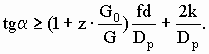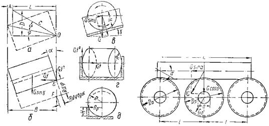 При повороте детали на угол dj величина линейного пути составит Rdj, а работа сопротивления от поперечного скольжения будет равна силе Gf (где G – вес детали), умноженной на путь Rdjtga (рис. 39, б), т. е. Gf Rdjtga. В точке касания детали с бортом возникает сила трения Gf2 (рис. 39, в, г), которая при повороте на угол g выполнит работу Gf2 Rdj. При наклоне лотка на угол g к горизонту (рис. 39, в) движущей силой является слагающая сила веса Gsing, работа которой на перемещении Rdj должна быть равна сумме работ всех сил сопротивлений, т. е. GsingRd³ j Gf Rd jGf2 Rdj, Откуда sin³gf tga+f2. (81) Если высота борта лотка Н меньше радиуса детали R (рис. 39, д), то должен быть пересчитан угол перекоса a, который определяется при той же длине Детали для несколько уменьшенного расчетного радиуса Rр, равного Rр= или Rр= Угол наклона лотков-скатоа в значительной мере зависит от качества отделки лотков и от состояния по.верхиости деталей. Для тщательно изготовленных лотков и обработанных деталей значения углов наклона лотка к горизонту, получаемые по формуле (81), следует увеличивать на 20 – 30%, а для обычных условий – на 50%. Для заготовок, имеющих поверхностные дефекты в виде полос и выступов, а также для необработанных деталей угол наклона лотков приходится увеличивать в 2,5 – 3 раза против расчетного. Высоту открытых лотков следует брать не меыее радиуса, а надежнее – не менее диаметра детали. Если детали имеют одностороннюю полость, вследствие чего центр тяжести их смещается в сторону (например, поршни), высоту бортов лотка следует брать не менее диаметра, в противном случае, как показывает практика, возможно выкатывание деталей из лотка. При конструировании роликовых лотков необходимо установить размеры роликов и осей, шаг между ними, а также угол наклона лотка к горизонту. Движущей силой на роликовом лотке является проекция веса детали (рис. 40) на направлении движения Gsina. Сопротивление движению возникает от трения качения детали по ролику под действием нормальной составляющей силы веса (для простоты рассуждения все сопротивления отнесены к одному ролику), равной Величина силы трения на поверхности цапфы будет равна fGcosa+f zG0, а на поверхности ролика (Gcosa+zG0)fd/Dp где d– диаметр оси ролика. Условия равновесия детали на роликовом лотке выразятся уравнением Gsina =(Gcosa+zG0) Принимая ввиду малой величины угла a cosa=1 и sina =tga. получим наименьший допускаемый наклон роликового лотка