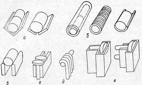 Рис. 41. Лотки-склизы. Угловые лотки бывают цельные из стандартного углового железа и составные из полос. У последних угол между станками может быть более значительным, они более компактиы и могут применяться для транспортирования крупных и тяжелых деталей. На рис. 41, б показаны лотки трубчатого сечения; они могут быть круглые и полукруглые. Круглые лотки делаются жесткими из трубопроката и гибкими из проволоки в виде пружин или резинового шланга. В трубчатых лотках премещаются стержневые детали вдоль оси. Гибкие лотки трубчатого сечения применяются там, где требуется изменять направление лотка, или там, где одновременно с изменением направления имеет место вращение лотка. Рельсовые лотки служат для перемещения стержневых деталей вдоль оси, например поршней (рис. 41, в), деталей с буртом (рис. 41, г), клапанов, болтов, толкателей, шатунов или крючковых деталей (рис. 41, д). Встречаются и однорельсовые лотки-склизы для перемещения деталей с буртом полуоткрытого и закрытого типов. Располагаются они главным образом вертикально (рис. 41, е).