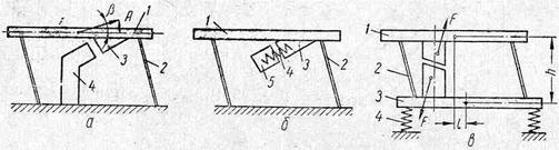 Рис. 46. Схемы лотков с электромагнитными вибраторами. В одномассном вибролотке желоб 1 (рис. 4б,а) устанавливается на наклонных пружинах 2, и система настраивается в околорезонансный режим. Направлениая подвеска (пружины 2) обеспечивает постоянство амплитуды А по длине желоба и ее направление под углом b к горизонту, называемом углом бросания. Якорь 3 электромагнитного вибратара крепится к желобу, а электромагнит 4 – к неподвижному основанию. Жесткое крепление одномассного резонансного дотка к основанию станка вызывает довольно ощутимые колебания последнего, что ограничивает область его применения. Кроме того, при жесткой резонансной подвеске в местах заделки пружин возникают значительные изгибавщие моменты. Поэтому желобы лотков должны обладать значительной жесткостью и, следовательно, иметь небольшую длину. Для снижения вибрации и уменьшения требуемой жесткости желоба его устанавливают на мягкой (зарезонансной) подвеске. В лотках этого типа используют двухмассную схему (рис. 46, б), позволяющую осуществить околорезонансный режим, Одной массой является желоб 1, установленйый на плоских наклонных пружинах 2 незначительной жесткости, другой – электромагнит 5 вибратора. Электромагнит соединен с желобом при помощи пружин 4, рассчитанных на работу в резонансном режиме. Якорь 3 жестко крепится к желобу. В такой двухмассной системе амплитуды колебаний желоба и электромагнита обратно пропорциональны массам. Для получения требуемой амплитуды колебаний транспортирующего органа и уменьше- кия зазора в электромагните его массу приходится увеличивать, а так как для полезной работы может быть использована только одна из колеблющихся маес, то вес транспортера получается значительным. В таких лотках возникают вредные крутильные колебания. Они очень малы и их воздействие при транспортировке деталей большинства типоразмеров практически незаметно. Но лучше все же применять полностью уравновешенную конструкцию. В основе ее также лежит двухмассная система (рис. 46, в), в которой массы соединены плоскими пружинами 2. Система устанавливается на амортизаторах 4. Вибратор создает две равные противоположно, направленные возмущающие силы F, прило- женные к массам 1 и 3. Для того чтобы полностью исключить возможность появления вредных крутильных колебаний вокруг центра тяжести систе мы, нарушающих постоянство амплитуды колебаний по длине желоба, следует выполнить условия l=0 и h=0, т. е. совместить центры тяжести обеих колеблющихся масс. Для лотков-транспортеров может применяться и любой иной привод, например пневматический, или комбинация из двух типов приводов. Закон колебаний лотка является асимметричным, поэтому перемещение деталей по лотку может осуществляться даже при возбуждении колебаний параллельно оси лотка. Паразитные колебания, присущие лоткам на наклонных пружинах, здесь отсутствуют.