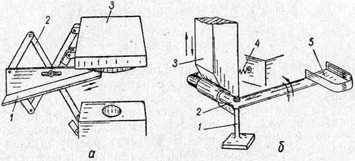 Рис. 55. Разгружатели прессов. В процессах для удаления изделий широко применяются также выносящие ковши. На рис. 55,б представлена схема действия сбрасывателя маятникового типа (клинового выносящего ковша), который может применяться для вырубных, дыропробивных и отрезных штампов. Деталь задерживается и в верхней части штампа выталкивается под. действием механического толкателя. К угловому рычагу 2, свободно вращающемуся на неподвижной оси 1 прикреплен ковш 5. Вывод ковша осуществляется клином 3, а ввод ковша в рабочую зону – пружиной 4. При подъеме ползуна ковш входит в зону, открытого штампа, улавливая падающую отштампованную деталь. При опускании клин выводит ковш из зоны штампа, и изделие сбрасывается в тару.