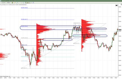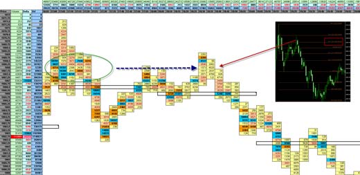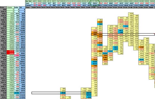 Итак, соотношение трейдеров 97/3 или 99/1 известно всем. Также известно, что не смотря на это соотношение все эти трейдеры делают свои трейды, но ведь трейды делаются на основе каких-то знаний. Самыми базовыми знаниями, которые переходят из одной книги классика в другую, является фибо уровни. Возьмем два самых распостранненых фибо уровня 62%(38%) и 162%, так или иначе многие используют эти значения как коррекционный (62%) и целевой (162%). Допустим, что с точки зрения среднесрочной торговли на дневных графиках мы подходим к некоему важному уровня 162% от первого импульса. Мы предполагаем, что среднесрочники в диапазоне 10-20 пунктов будут закрывать полностью или частично свои покупки, что по сути является выставленными ордерами продажи. Эти ордера будут скупаться и в итоге мы увидим аномалию дельты и выброс объема, один из признаков окончания тренда. Если здесь еще рядышком появится еще один не менее важный уровень, то объемы на порядок увеличатся.