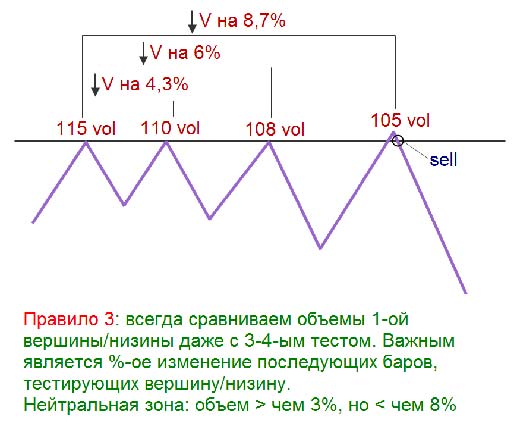 3. Всегда сравниваем объем 1-ой вершины/низины даже с 3-4 тестом. Важным является процентное изменение последнего бара, тестирующего вершину/низину. Нейтральная зона, если объем больше 3%, но меньше 8%.