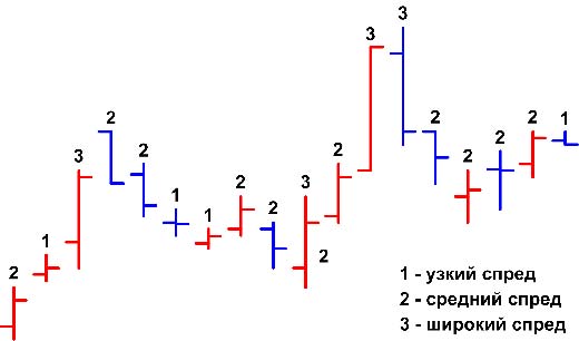 Ширина спреда показывает волатильность за определенный промежуток времени. С точки зрения поведенческого трейдинга, ширина спреда дает нам возможность понять, насколько активно велась торговля в этот период времени. Размер соотносится с предыдущими 20-30 барами. Делается это на глаз, но поверьте, это вполне объективно, если сомневаетесь, то можете воспользоваться индикаторами, которые показывают относительную величину спреда бара. Но, конечно, было бы лучше, если Вы научитесь "на глаз" видеть все бары и идентифицировать паттерны ВСА. На самом деле, это достаточно просто и при недолгой практике Вы научитесь быстро.