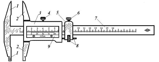 Рис. 1. Устройство штангенциркуля: (1 – неподвижная измерительная губка, 2 - измерительные губки, 3 – подвижная рамка, 4 - винт, 5 - рамка, 6 – стопорный винт, 7 – стальная линейка, 8 - микрометрическая подачадля установки рамки на точный размер, 9- нониус)