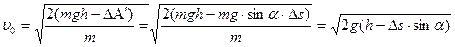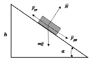 При подъеме незакрепленного конца наклонной плоскости на некоторую высоту h, соответствующую значению угла наклона α0, компонента Fдв, становится равной силе трения покоя Fтр0, и тело, в соответствии с первым законом Ньютона, начинает равномерно скользить вниз по плоскости. Скорость равномерного движения v0 может быть найдена из энергетического баланса (если пренебречь иными потерями):