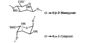 Коммерческие препараты этой подгруппы пищевых добавок объединяют полисахариды, выделяемые из красных и бурых морских водорослей. В пищевой промышленности широко используют альгинаты, каррагинаны и агароиды. Альгиновая кислота (Е400) и ее соли (Е401 — Е405). Эта подгруппа представляет собой полисахариды бурых морских водорослей родов Laminaria и Macrocystis (alga в переводе с латинского — водоросль), которые построены из остатков β-D-маннуроновой и α-L-гулуроно-вой кислот, находящихся в пиранозной форме и связанных в линейные цепи 1,4-гликозидными связями. Фрагменты молекул этих кислот в наиболее энергетически выгодной конформации представлены на рис. 3.5.