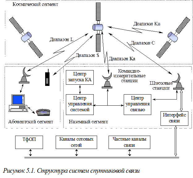 Количество спутников в орбитальной группировке определяется из соображений полного охвата обслуживаемой территории. Например, для низкоорбитальной группировки с орбитой 1000 км и при скорости спутника 7 км/с время видимости спутника составляет 14 минут; после этого спутник «уходит» за линию горизонта и, для обеспечения непрерывности связи, на смену ему должен приходить следующий, за ним – третий и т.д. Т.о. количество спутников будет определяться отношением периода обращения спутника вокруг Земли к периоду нахождения спутника в зоне видимости. С увеличение высоты орбиты увеличивается время видимости спутника, соответственно, уменьшаются требования к численности орбитальной группировки, однако, из-за увеличения дальности связи требуется более сложное и дорогостоящее оборудование. Численность орбитальной группировки определяется компромиссом между стоимостью и объёмом оказываемых услуг и простотой и стоимостью подвижного спутникового терминала. Обеспечение связи абонента, находящегося в зоне видимости одного спутника, с абонентом, находящимся в зоне видимости другого спутника, организуется посредством связи между спутниковыми ретрансляторами (по цепочке, пока информация не дойдёт до спутникового ретранслятора второго абонента). В некоторых системах эту функцию выполняют шлюзовые станции, транслирующие информацию с одного спутника на другой. Наземный сегмент включает: - центр управления системой; - центр запуска КА; - центр управления связью; - шлюзовые станции. Центр управления системой осуществляет слежение за КА, расчёт их координат, сверку и коррекцию времени, диагностику бортовой аппаратуры, передачу командной информации и т.д. функции управления осуществляются на основе телеметрической информации, получаемой от каждого КА группировки. Благодаря использованию территориально разнесённых контрольно-измерительных станций центр управления системой с достаточно высокой оперативностью выполняет: контроль запуска и точность вывода КА на заданную орбиту, контроль состояния каждого КА, контроль и управление орбитой каждого КА, разрешение нештатных ситуаций, вывод КА из состава орбитальной группировки. Центр запуска КА определяет программу запуска, осуществляет сборку ракеты-носителя, установку полезной нагрузки КА, предстартовую проверку; после запуска ракеты-носителя - траекторные измерения на активном участке полёта, которые передаёт в центр управления системой для корректировки последующей траектории. Центр управления связью планирует использование ресурса спутника, посредством шлюзовых станций контролирует и управляет связью. В нормальных условиях работы орбитальной группировки связь со шлюзовой станцией и пользовательскими терминалами осуществляется автономно. В нештатных ситуациях (неработоспособность КА, оборудования спутникового ретранслятора или шлюзовой станции) центр переходит в режим поддержания связи с повышенной нагрузкой, или проводит реконфигурирование сети. Абонентский сегмент определяется номенклатурой предоставляемых спутниковой системой связи услуг: связь абонентов спутниковой сети с абонентами спутниковой сети, ТфОП, пейджинговых и сотовых сетей, определение местоположения (координат) абонентов. Абонентское оборудование разделяют на переносные спутниковые терм