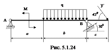 Задача 5.1.10. На балку (рис.5.1.24), действует сосредоточенная сила F =20 кН, пара сил с моментом М = 40 кНм и распределенная нагрузка интенсивностью q = 10 кН/м. Линейные размеры: а =2 м, b= 3 м, с= 1 м. Определить реакции связей балки.