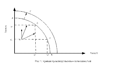 Предположим, что мы располагаем такими ресурсами, которые позволяют произвести как товар А, так и товар В. Поскольку величина ресурсов ограничена, то ограниченными будут и максимальные результаты их использования (для товара А - точка “ А ”, для товара В - точка “ В ”). Если мы теперь соединим точки максимумов (“ А ” и “ В ”), то получим “кривую производственных возможностей”. Само название показывает, что она обозначает границы (объемы) максимально возможного одновременного производства товаров А и В при полном использовании ограниченных производственных ресурсов. Действительно, каждая точка на этой кривой (см., например, точки “ С ” и “ D ”) показывает, какой максимум товара А и какой максимум товара В может быть одновременно произведен при выборе той или иной точки. Поскольку модель представляет полное использование ресурсов, прирост А может идти только за счет уменьшения В (и наоборот). Следовательно, выбор оптимального решения ограничен числом вариантов, представленных совокупностью точек данной кривой (при прочих равных условиях). Благодаря графику производственных возможностей удалось выделить совокупность всех “точек” (решений), в пределах которых следует искать оптимальный вариант. Какая именно точка на кривой производственных возможностей будет признана оптимальной, зависит от множества конкретных обстоятельств, однако в данном случае важно то, что определена область поиска оптимума. Альтернативная Итак, каждая точка на кривой производственных - цена возможностей есть жестко заданное количественное соотношение “ А ” и “ В ”. Следовательно, перед нами каждый раз - соотношение максимальных величин, находящихся в обратном отношении друг к другу: чем больше будет произведено товара А, тем меньше будет произведено товара В (и наоборот). Это значит, что кривая производственных возможностей характеризует отрицательную зависимость между парными величинами максимальных результатов производства (при условии полного использования ограниченного объема производственных ресурсов). Сравним еще раз точки С и D. Выбор той или иной точки будет означать, чему мы отдали предпочтение - производству товара А либо производству товара В. В самом деле, если мы находимся в точке С и решили перейти к точке D, то это свидетельствует об увеличении производства товара В и потере товара А. График производственных возможностей потому-то и показывает максимальное (эффективное) использование ресурсов, что увеличение производства товара В невозможно без уменьшения производства товара А (и наоборот). Иначе говоря, полное использование ресурсов - это ситуация, когда рост одного результата может идти только за счет уменьшения другого результата. А это превращает теряемую величину “другого результата” в своего рода неизбежную плату за прирост первого результата. Кривая производственных возможностей интересна тем, что она наглядно показывает эту обязательную плату в каждой точке. Такая плата, потеря получила в экономической теории название “ альтернативная цена. ” Неэффективное Продолжим наш анализ. Пространство рассматриваемого использование графика “заселено” еще множеством точек, часть из ресурсов которыхнаходится “внутри”, а часть - “вне” кривой производственных возможностей. Если мы возьмем точку, находящуюся внутри