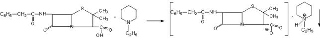 избыток I2 + 2Na2S2O3 = 2 NaI + Na2S4O6 УЧ =1/8, формула обратного титрования. Одновременно проводят контрольный опыт. 2) определение бензилпенициллина проводят весовым методом, основанным на образовании N-этилпиперидиновой соли бензилпенициллина