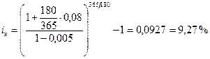 □ Пример 1.20. При выдаче ссуды на 180 дней под 8% годовых (проценты простые) кредитором удержаны комиссионные в размере 0,5% суммы кредита. Какова эффективность ссудной операции в виде годовой ставки сложных и простых процентов? (K =365).