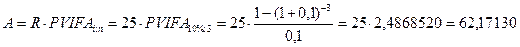 — дисконтный множитель за t лет. □ Пример 2.6. Строительной фирмой заключён контракт на строительство здания. Согласно контракту заказчик через два года после окончания строительства производит оплату в течение трёх лет равными годовыми платежами, производимыми в конце года, в размере 25 тыс. ден. ед. каждый. Процентная ставка установлена в 10% годовых; проценты начисляются в конце года. Определить выигрыш заказчика, полученный в результате отсрочки платежа на два года. Решение. Современная величина немедленной ренты