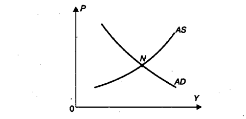 Рис. 2. Кривая совокупного предложения В краткосрочном периоде (два-три года) кривая совокупного предложения согласно кейнсианской модели будет иметь положительный наклон, близкий к горизонтальной кривой (AS1). В долгосрочном периоде при полной загрузке мощностей и занятости рабочей силы кривая совокупного предложения может быть представлена в виде вертикальной прямой (AS2). Выпуск примерно одинаков при различном уровне цен. Изменения размеров производства и совокупного предложения будут происходить под влиянием сдвигов производственных факторов, прогресса технологии. Пересечение кривых AD и AS в точке N отражает соответствие равновесной цены и равновесного объема производства (рис. 3). При нарушении равновесия рыночный механизм будет выравнивать совокупный спрос и совокупное предложение; сработает, прежде всего, ценовой механизм. В данной модели возможны следующие варианты: 1) совокупное предложение превышает совокупный спрос. Сбыт товаров затруднен, запасы нарастают, рост производства тормозится, возможен его спад; 2) совокупный спрос обгоняет совокупное предложение. Картина на рынке иная: запасы сокращаются, неудовлетворенный спрос стимулирует рост производства. Экономическое равновесие предполагает такое состояние хозяйства, когда используются все экономические ресурсы страны (при наличии резерва мощностей и «нормальном» уровне занятости). В равновесной экономике не должно быть ни изобилия простаивающих мощностей, ни избыточной продукции, ни чрезмерного перенапряжения в применении ресурсов.