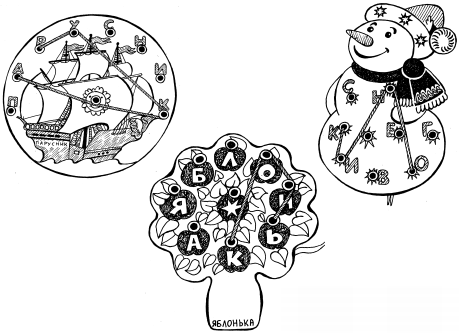 Шнур-грамотей Игра состоит из деревянного макета яблони (снеговика, ромашки, парусника). На макете большими буквами написано слово. Например, ЯБЛОНЬКА. Около каждой буквы есть металлическая кнопка с дырочкой. В серединке звездочка с такой же кнопочкой. Звездочка будет заменять любую букву алфавита. К игре прилагается шнурок.