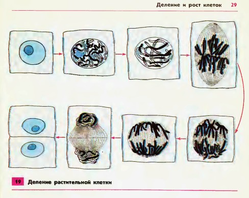 В некоторых участках органов растений клетки часто делятся, благодаря чему число клеток увеличивается. Делению клетки предшествует деление ее ядра. Перед делением клетки ядро увеличивается и в нем становятся хорошо заметными тельца обычно цилиндрической формы — хромосомы (от греческих слов «хромо» — цвет, «сома» — тело) Они передают наследственные признаки от клетки к клетке 18. Более подробно с этим процессом вы познакомитесь при изучении общей биологии. Но запомните главное — делением клетки начинается с деления ядра и каждое из ядер двух образовавшихся клеток содержит то же самое число хромосом, что и ядро исходной клетки 19. Это объясняется тем, что перед делением клетки число хромосом удваивается. Все живое содержимое клетки также равномерно распределяется между двумя новыми клетками. Молодые клетки, в отличие от старых, неспособных делиться, содержат много мелких вакуолей. Ядро молодой клетки располагается в центре.